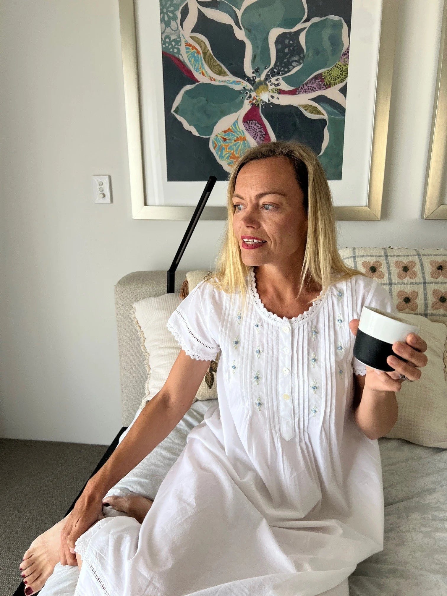 100% pure cotton cambric short sleeve nightgown with soft cotton lace trim and ladder lace trim on the sleeves, hemline and neckline. With front buttons and delicate blue and green hand embroidered rosebuds and leaves this 44” length nightgown has been a bestseller for many years. It’s vertical front pintucks make it comfortable and suitable for all shapes and sizes including our bigger busted ladies. We source the highest quality soft, cool cotton that is both durable and light and washes like a dream.